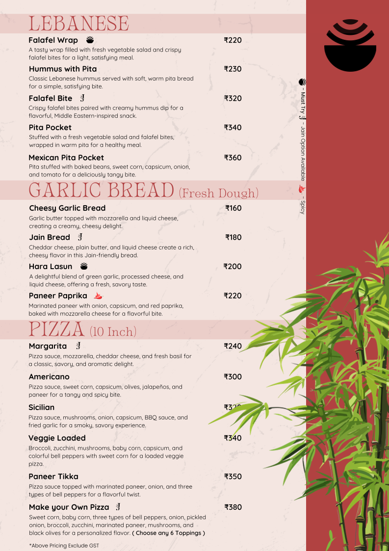 Sweet corn, baby corn, three types of bell peppers, onion, pickled onion, broccoli, zucchini, marinated paneer, mushrooms, and black olives for a personalized flavor. (Choose any 6 Toppings)